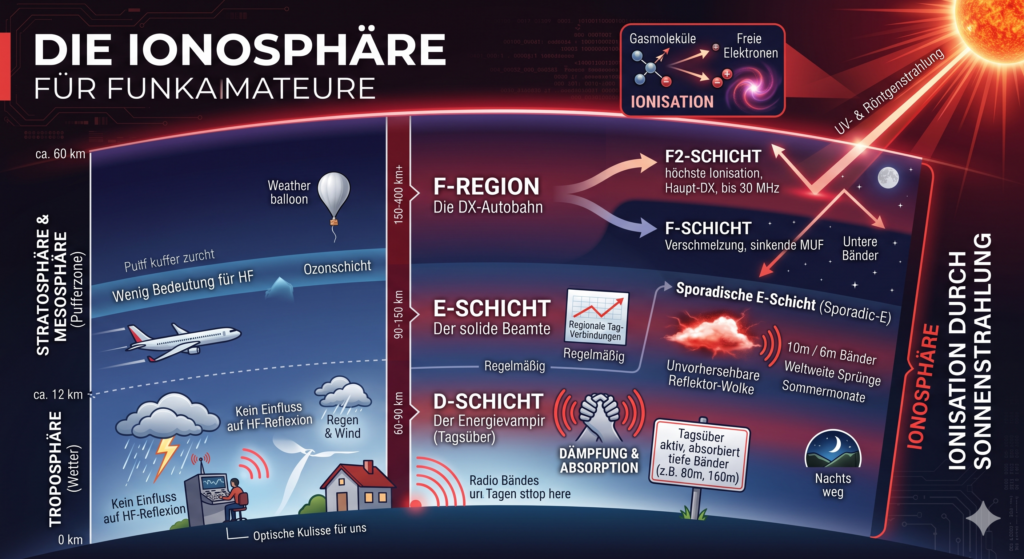 • Troposphäre: Das ist unser Erdgeschoss, das von 0 bis etwa 10 oder 12 km reicht. Hier findet das statt, was die Meteorologen im Fernsehen mit bunten Karten und Zeigestäben erklären: Regen, Wind und Gewitter. Für uns Kurzwellenfunker ist das Ganze eher eine optische Kulisse, denn das Wetter in der Troposphäre hat absolut keinen Einfluss auf die Reflexion an der Ionosphäre. Wenn es also draußen in Strömen schüttet und du im Funkgerät nichts hörst, liegt das nicht an den Wolken – sondern höchstwahrscheinlich daran, dass deine Antenne abgesoffen ist oder die Sonne gerade ein Nickerchen macht.