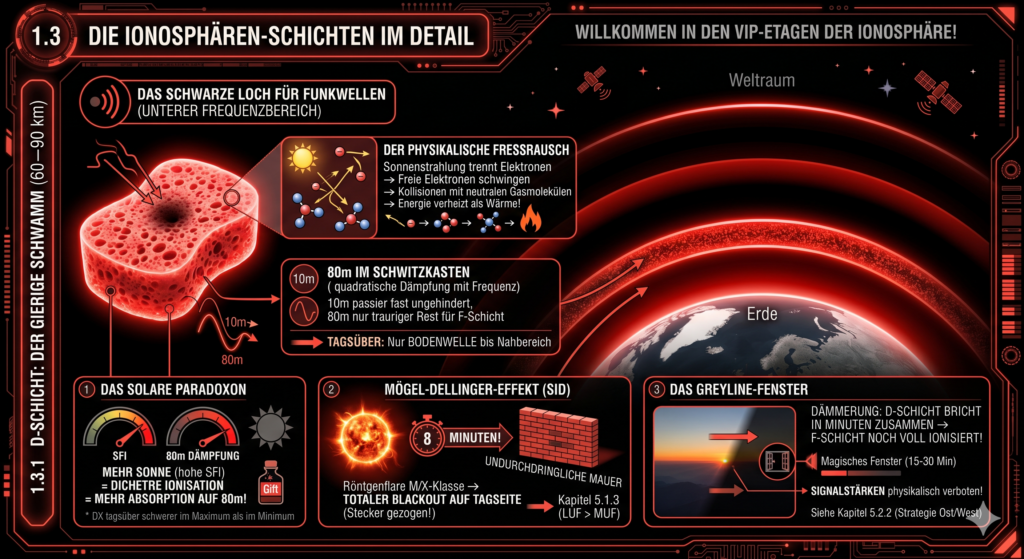 Die D-Schicht ist so etwas wie das schwarze Loch für Funkwellen im unteren Frequenzbereich. Während die höheren Schichten uns die Welt zu Füßen legen, hat die D-Schicht nur ein einziges Ziel: unsere mühsam in die Luft gepustete Energie in Wärme zu verwandeln. Herzlichen Dank dafür.